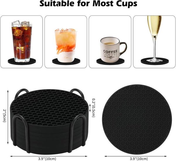 - FURNITURE PROTECTION:Soft silicone Coasters with holder protect the surface of your kitchen counter tabletop, office desk or dining table or Coffee table or Night table or wooden table from stains or water rings from nasty marks or scary scratch.