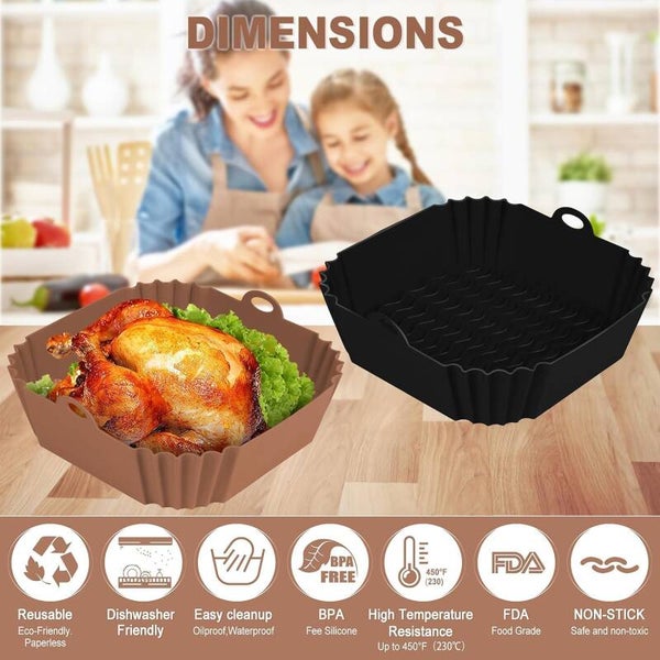 - [2-PCS Air Fryer Silicone Liners] Our square silicone air fryer liners is thicker, It's about 67mil thick, it's not fragile. 8 inches/ 20.5 cm in side length, 2.2 inches/ 5.5 cm in height, Fits 4 to 7 QT Air Fryer.