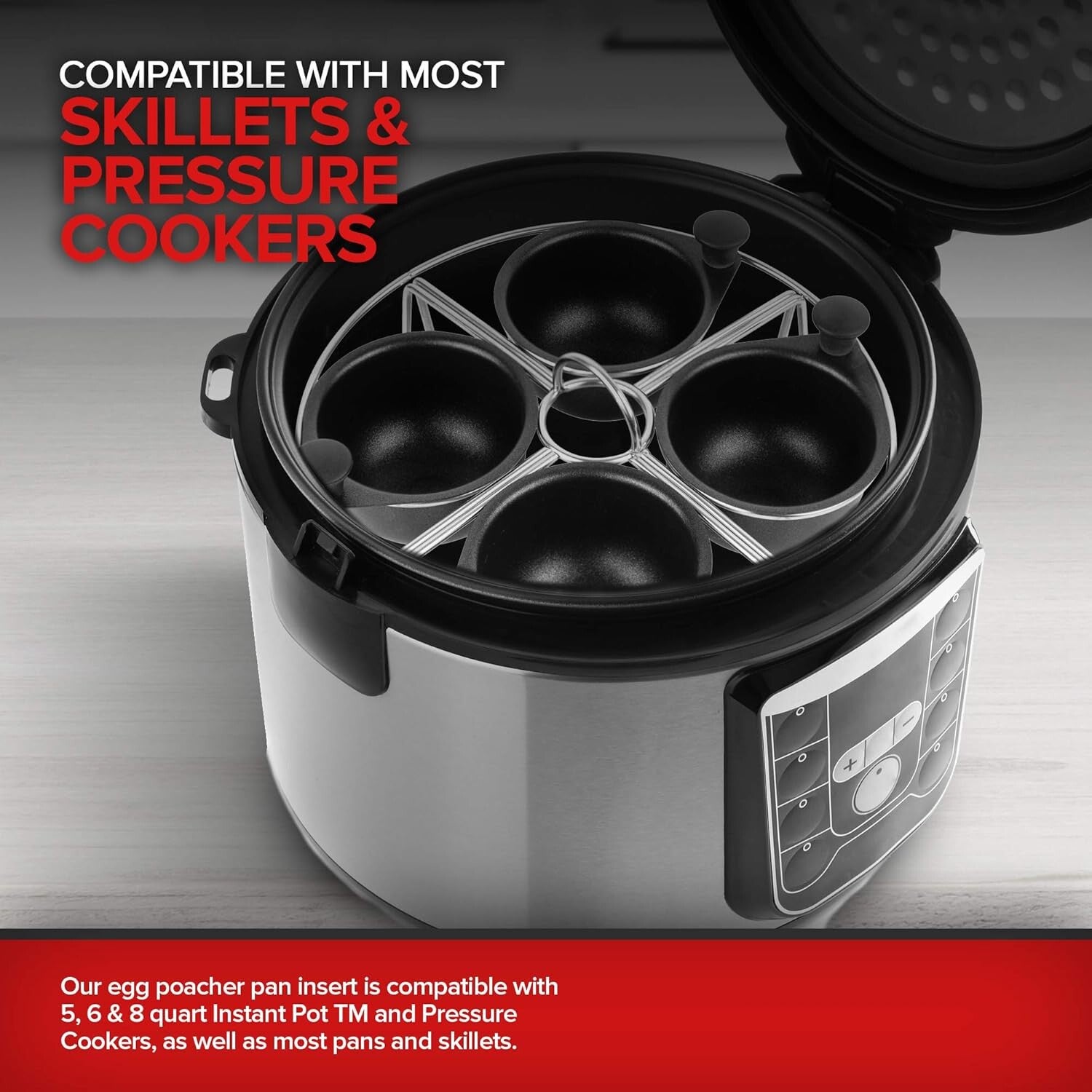 - Compatible with Most Skillets: Our poaching tray helps you poach eggs more evenly and faster than conventional poaching methods. It is also designed to keep the egg cups standing upright, preventing them from tipping over while you’re cooking. Our egg poacher pan insert is compatible with Instapot accessories such as 5, 6 & 8 quart Instant Pot TM and Pressure Cookers, as well as most pans and skillets.